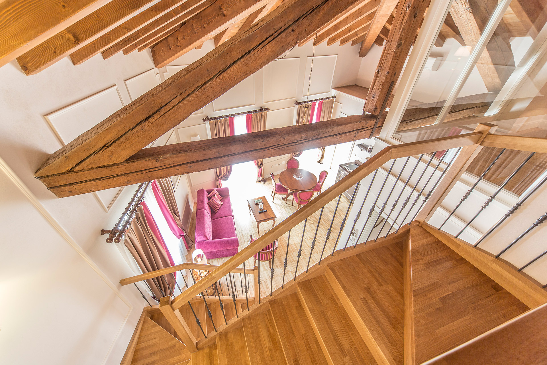 Caratterizzato da arredamento classic-chic, parquet in tutte le stanze e travi a vista, l'appartamento offre un'atmosfera accogliente e di charme con un delizioso balconcino privato, perfetto per rilassarsi e prendere un caffè.
